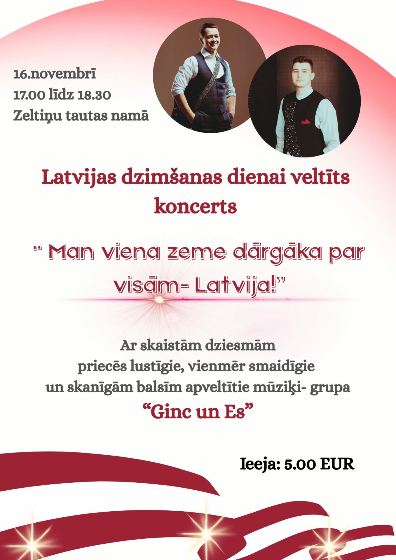 16.novembrī 17.00-18.30 Zeltiņu tautas namā Latvijas dzimšanas dienai veltīts koncerts “Man viena zeme dārgāka par visām – Latvija!”. Ar skaistām dziesmām priecēs lustīgie, vienmēr smaidīgie un skanīgām balsīm apveltītie mūziķi – grupa “Ginc un Es”. Ieeja: 5,00 EUR.