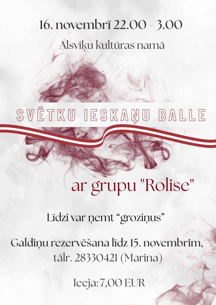 16.novembrī 22.00-3.00 Alsviķu kultūras namā svētku ieskaņu balle ar grupu “Rolise”. Līdzi var ņemt “groziņus”. Galdiņu rezervēšana līdz 15. novembrim pa tālruni 28330421 (Marina). Ieeja: 7,00 EUR.