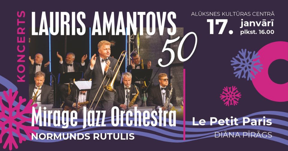 17.janvārī 16.00 Alūksnes Kultūras centrā koncerts “Lauris Amantovs 50”. Piedalās: “Mirage Jazz Orchestra”, Normunds Rutulis, ansamblis “Le Petit Paris” (“Mazā Parīze”), kopā ar Marko Ojalu un burvīgo Diānu Pīrāgs. Uz skatuves neatkārtojami mūziķi: Raivo Stašans, Artūrs Sebris, Indriķis Veitners, Mārcis Krastiņš, Gints Stepānovs, Normunds Piesis, Reinis Ausmanis, Oļegs Švembergs, Madars Kalniņš, Andris Grunte, Jurģis Lipskis, Marko Ojala, Raivo Ozols, Raimonds Kalniņš. Ieeja: 15,00 un 20,00 EUR. Biļetes: šeit.