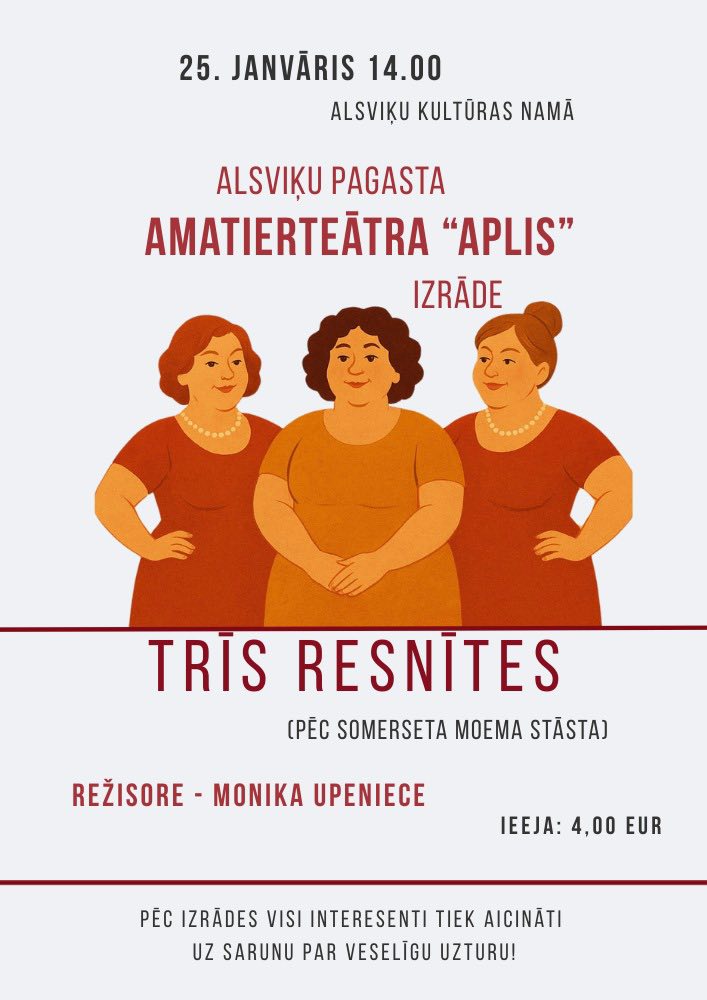 25.janvārī 14.00 Alsviķu kultūras namā Alsviķu pagasta amatierteātra “Aplis” izrāde “Trīs resnītes” (pēc Somerseta Moema stāsta), režisore Monika Upeniece. Pēc izrādes visi interesenti tiek aicināti uz sarunu par veselīgu uzturu. Ieeja: 4,00 EUR.