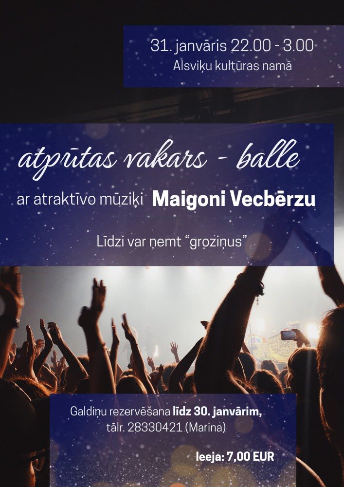 31.janvārī 22.00-3.00 Alsviķu kultūras namā atpūtas vakars – balle ar atraktīvo mūziķi Maigoni Vecbērzu. Līdzi var ņemt “groziņus”. Galdiņu rezervēšana līdz 30. janvārim pa tālruni 28330421 (Marina). Ieeja: 7,00 EUR.