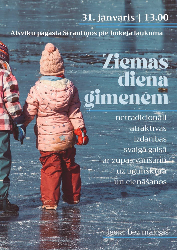 31.janvārī 13.00 Alsviķu pagasta Strautiņos pie hokeja laukuma Ziemas diena ģimenēm – netradicionāli atraktīvās izdarības svaigā gaisā ar zupas vārīšanu uz ugunskura un cienāšanos. Ieeja: bez maksas.