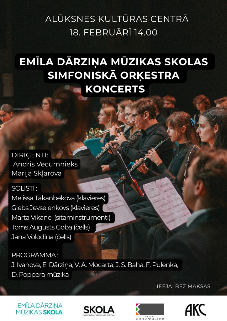 18.februārī 14.00 Alūksnes Kultūras centrā Emīla Dārziņa mūzikas vidusskolas simfoniskā orķestra koncerts. Ieeja bez maksas