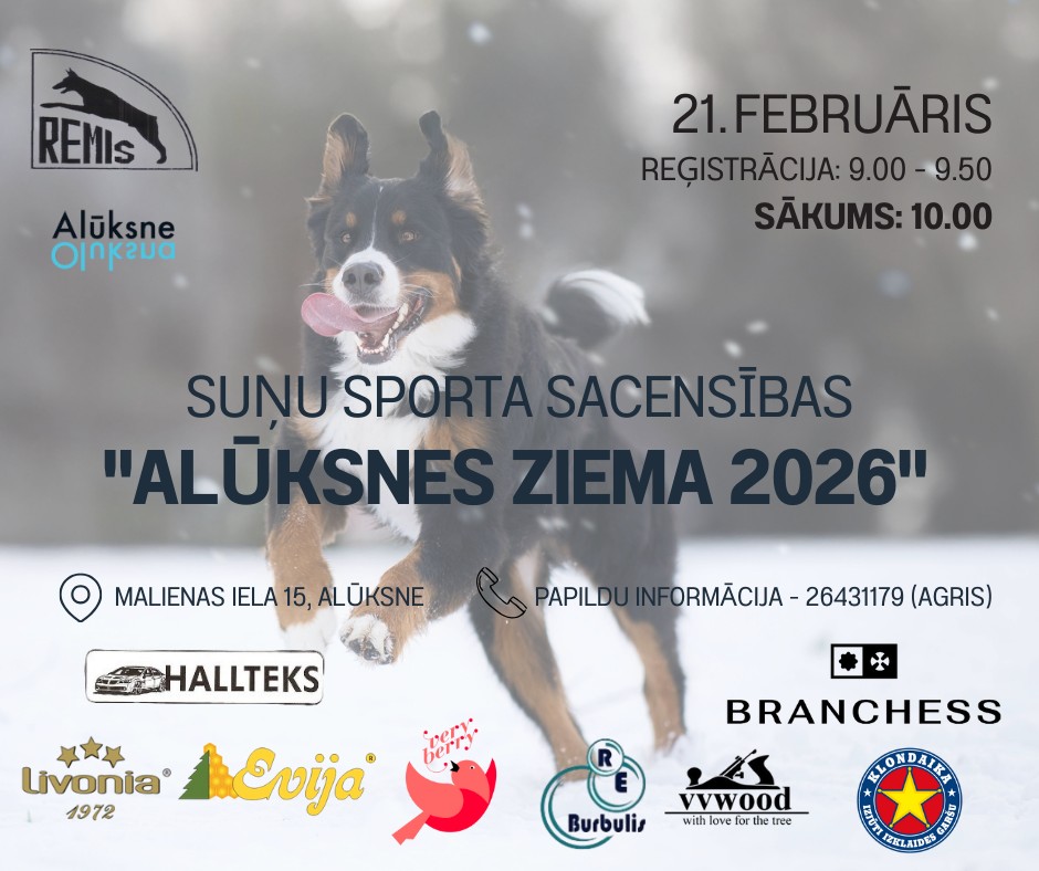 21.februārī 10.00 Malienas ielā 15, Alūksnē, suņu sporta sacensības “Alūksnes ziema 2026”.