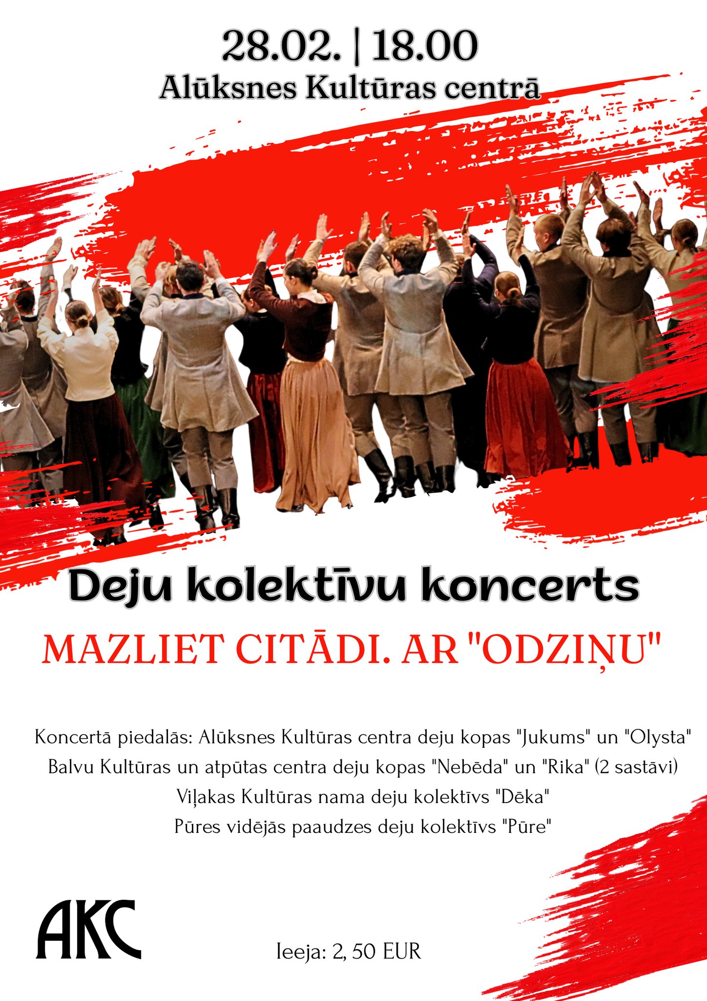 28.februārī 18.00 Alūksnes Kultūras centrā deju koncerts “Mazliet citādi. Ar “odziņu”.” Piedalās: Alūksnes Kultūras centra deju kopas “Jukums” un “Olysta”, Balvu Kultūras un atpūtas centra deju kopas “Nebēda” un “Rika” (2 sastāvi), Viļakas Kultūras nama deju kolektīvs “Dēka”, Pūres vidējās paaudzes deju kolektīvs “Pūre”. Ieeja: 2,50 EUR.