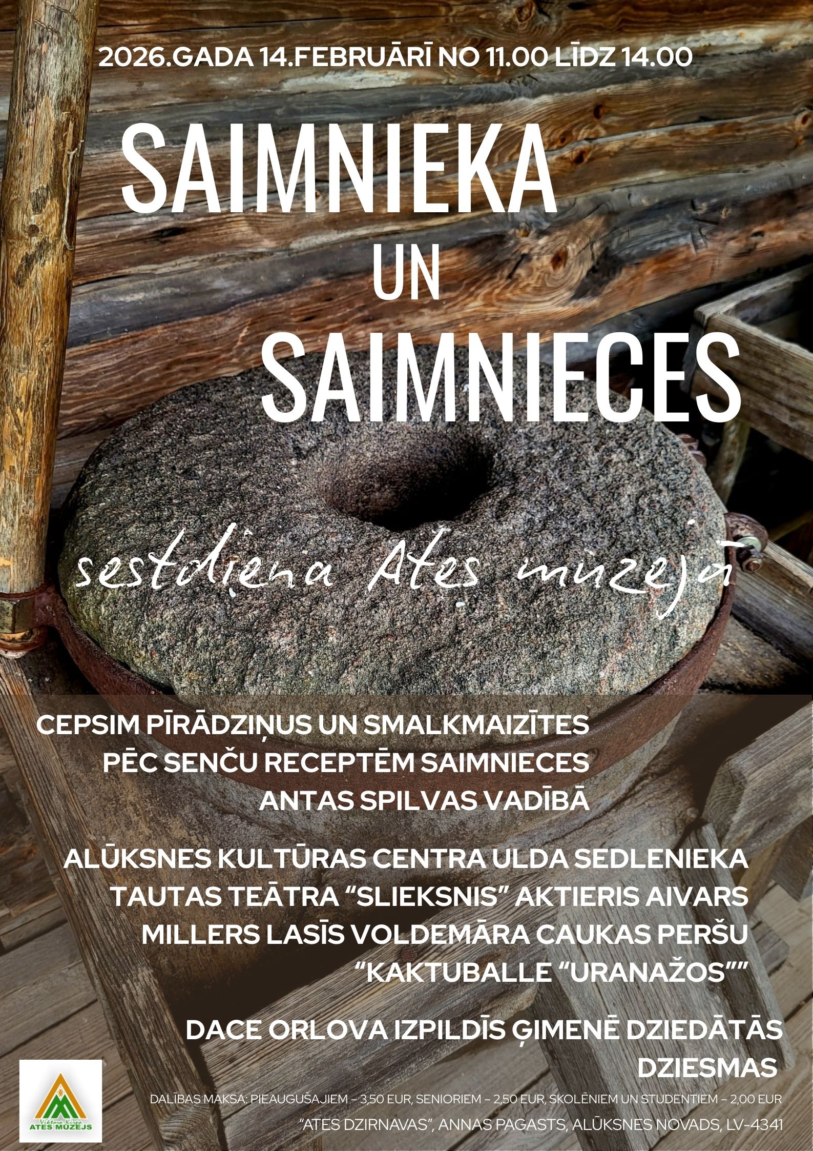 14.februārī no 11.00 Viktora Ķirpa Ates muzejā “Vidzemes lauku sēta” Saimnieka un saimnieces sestdiena. Cepsim smalkmaizītes pēc senču receptēm, lasīsim Voldemāra Caukas peršu “Kaktuballe “Uranažos”” un apgūsim dažus dančus. Dalības maksa – ieeja muzejā: pieaugušajiem – 3,50 EUR, senioriem – 2,50 EUR, skolēniem un studentiem – 2,00 EUR.