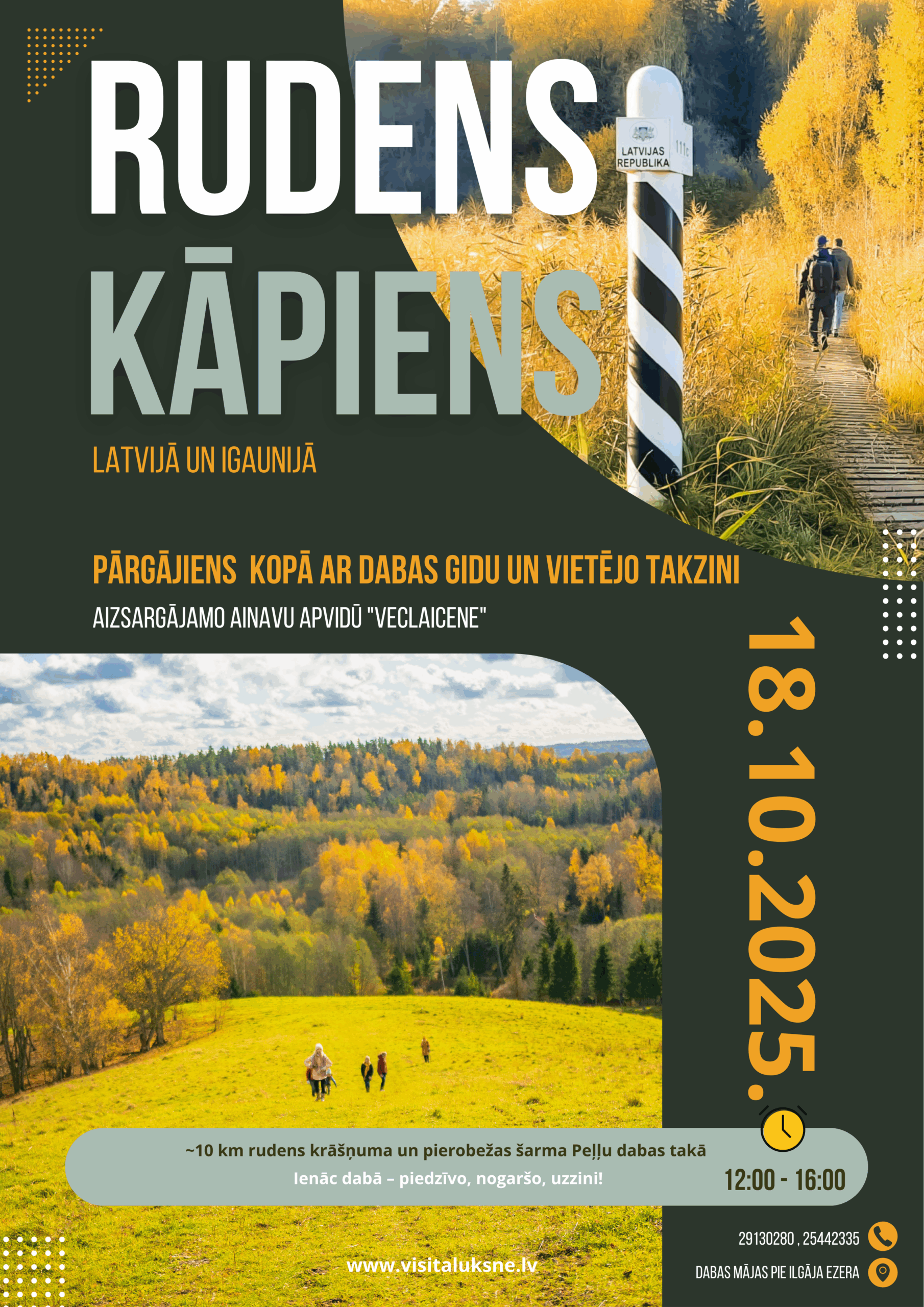 Kad rudens ir pašā krāšņumā, 18. oktobrī plkst. 12.00, taku gājēji, veselīga dzīvesveida cienītāji un dabas mīļotāji tiek aicināti uz pārgājienu “RUDENS KĀPIENS”, lai sajustu divu valstu klātbūtni un redzētu, kā izskatās rudens Latvijā,- pakāpjoties Igaunijā. Tas būs piedzīvojums, kurā dabas izziņa savīsies ar fizisku kustību un kopības sajūtu, dodoties apmēram 10 kilometru garā maršrutā pa Peļļu dabas taku, kopā ar ornitologu un dabas gidu Elviju Kantānu, un vietējo takzini un stāstnieku Jāni Prangeli.