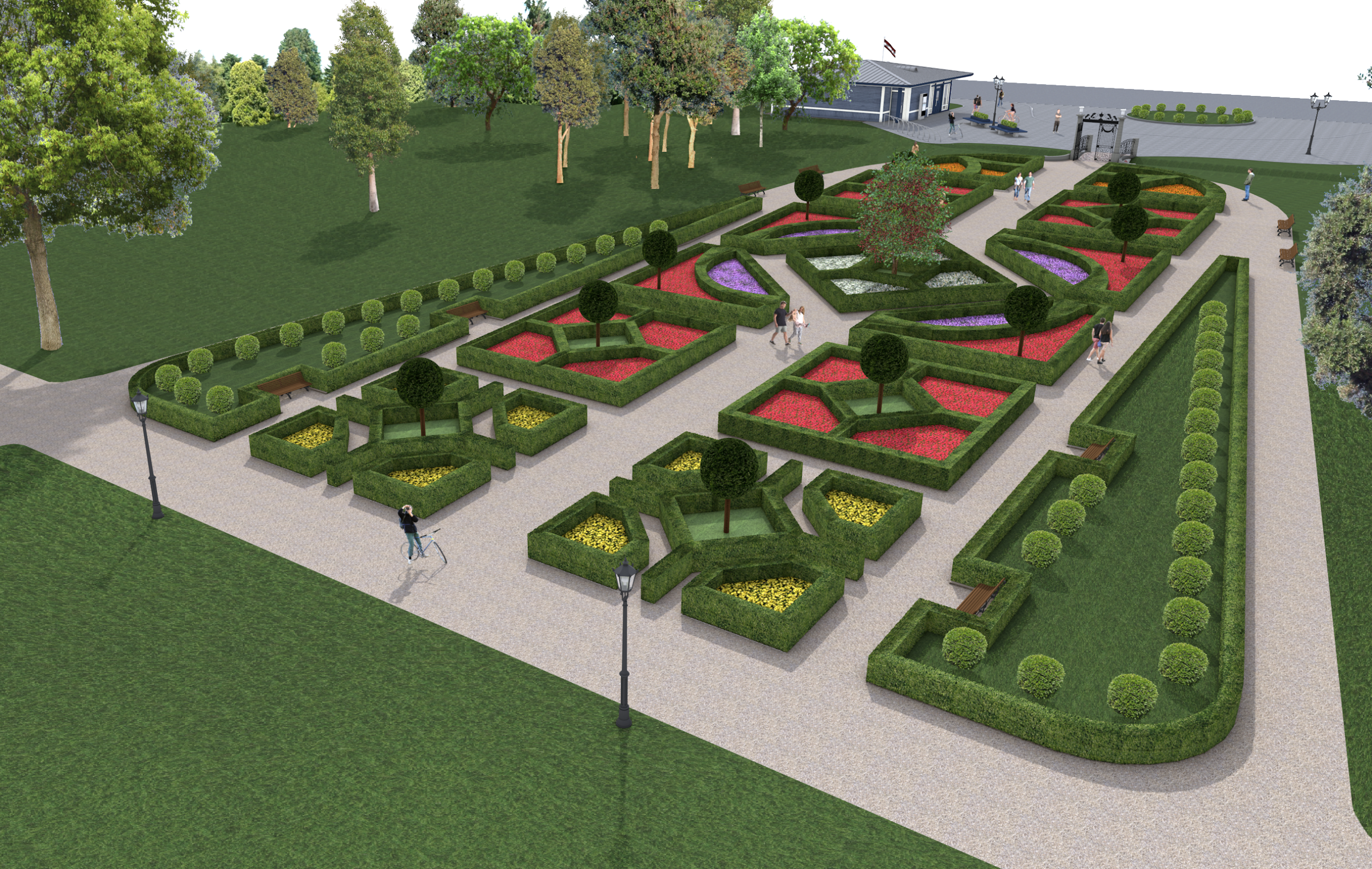 Dārza regulāro plānojumu veidos vairākas garenejas un šķērsejas, kā arī simetriski izkārtotas, dzīvžoga ieskautas puķu dobes ar dekoratīviem košumkrūmu, lapu koku un cirptu skujeņu stādījumiem. Līdztekus paredzēta arī dārzu aptverošās parka teritorijas stādījumu un koku sakopšana.