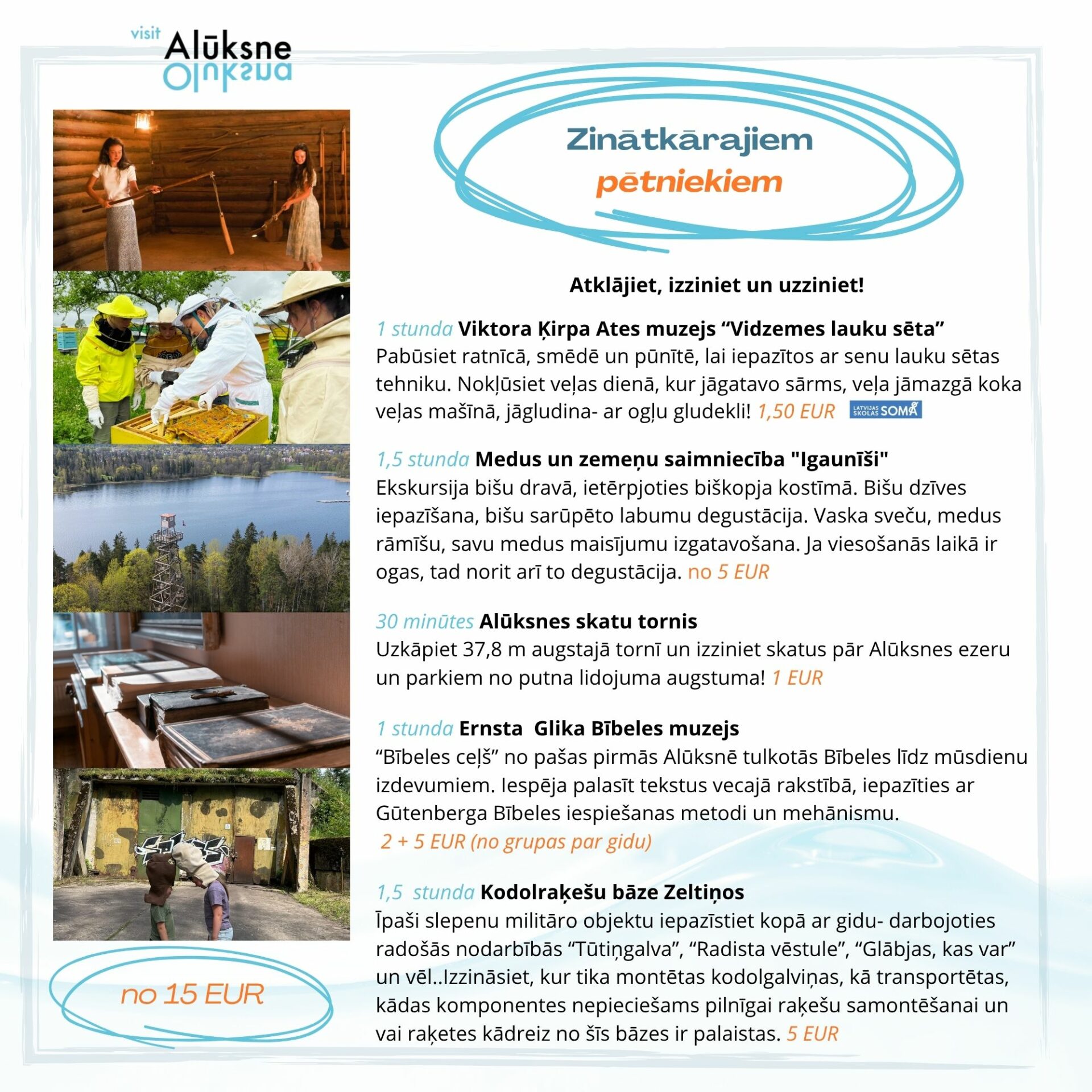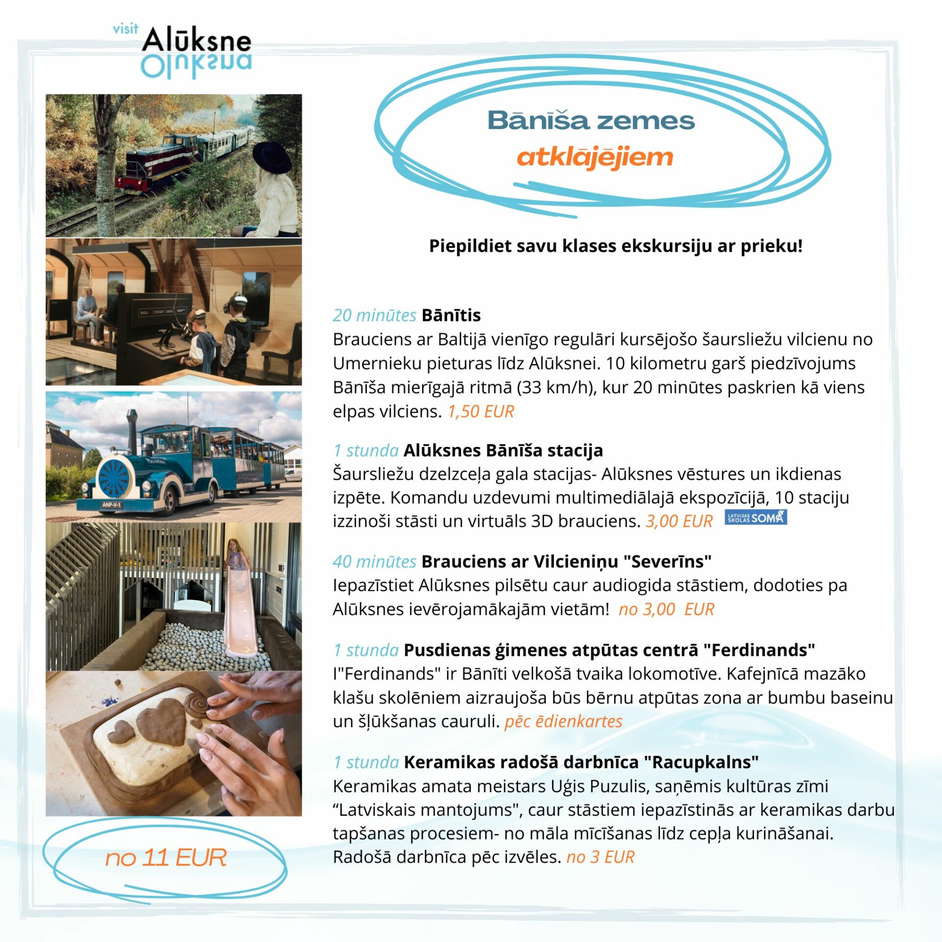 Skolēniem viens no gaidītākajiem notikumiem, neatkarīgi no mācību mēneša un gadalaika, ir klases ekskursijas! Alūksnes Tūrisma informācijas centrs ir sagatavojis piedāvājumus aizraujošai un interesantai kopā būšanai.