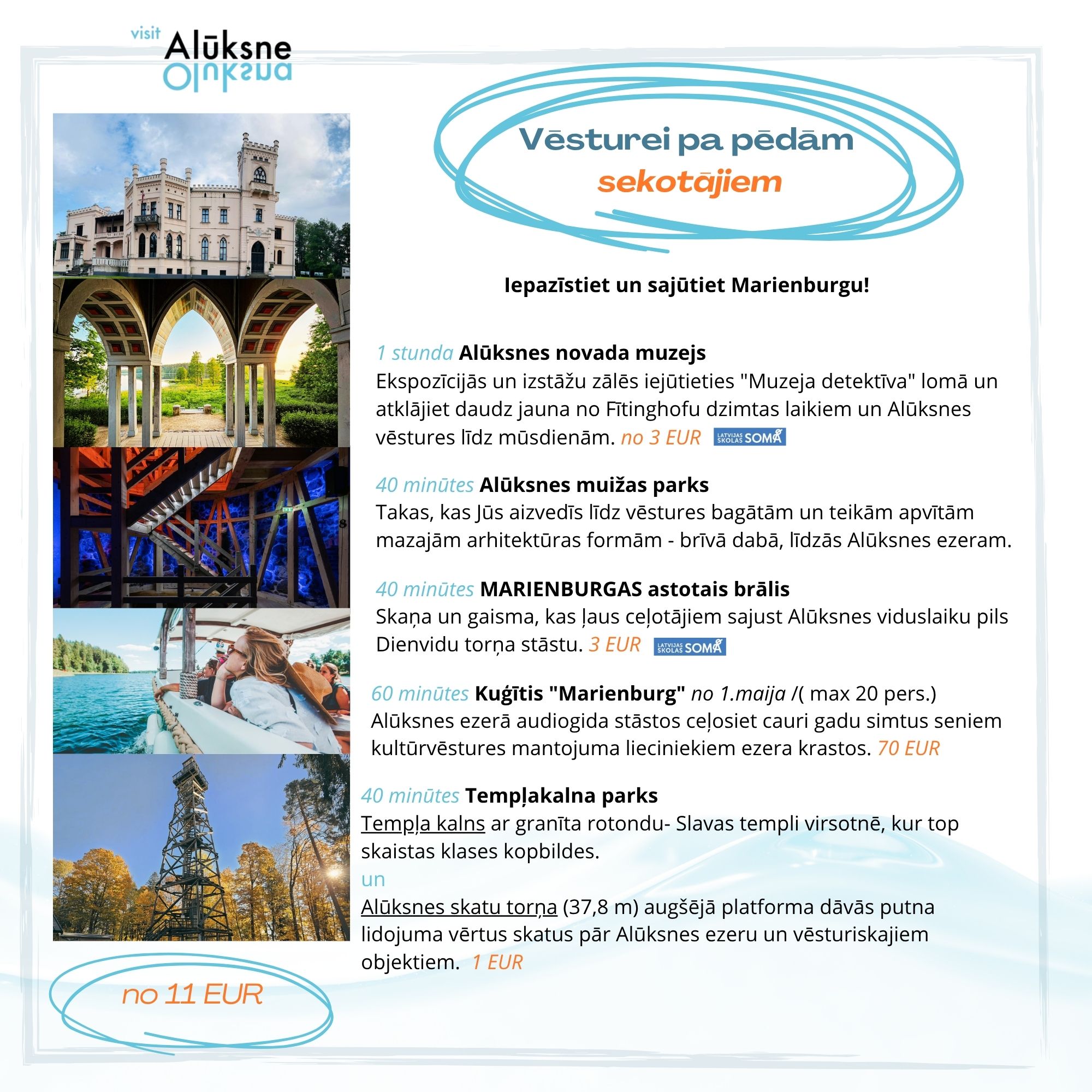 “Vēsturei pa pēdām” sekotājiem- Alūksnes novada muzejs, Alūksnes muižas parks, “MARIENBURGAS astotais brālis”, Kuģītis “MARIENBURG”, Tempļakalna parks.