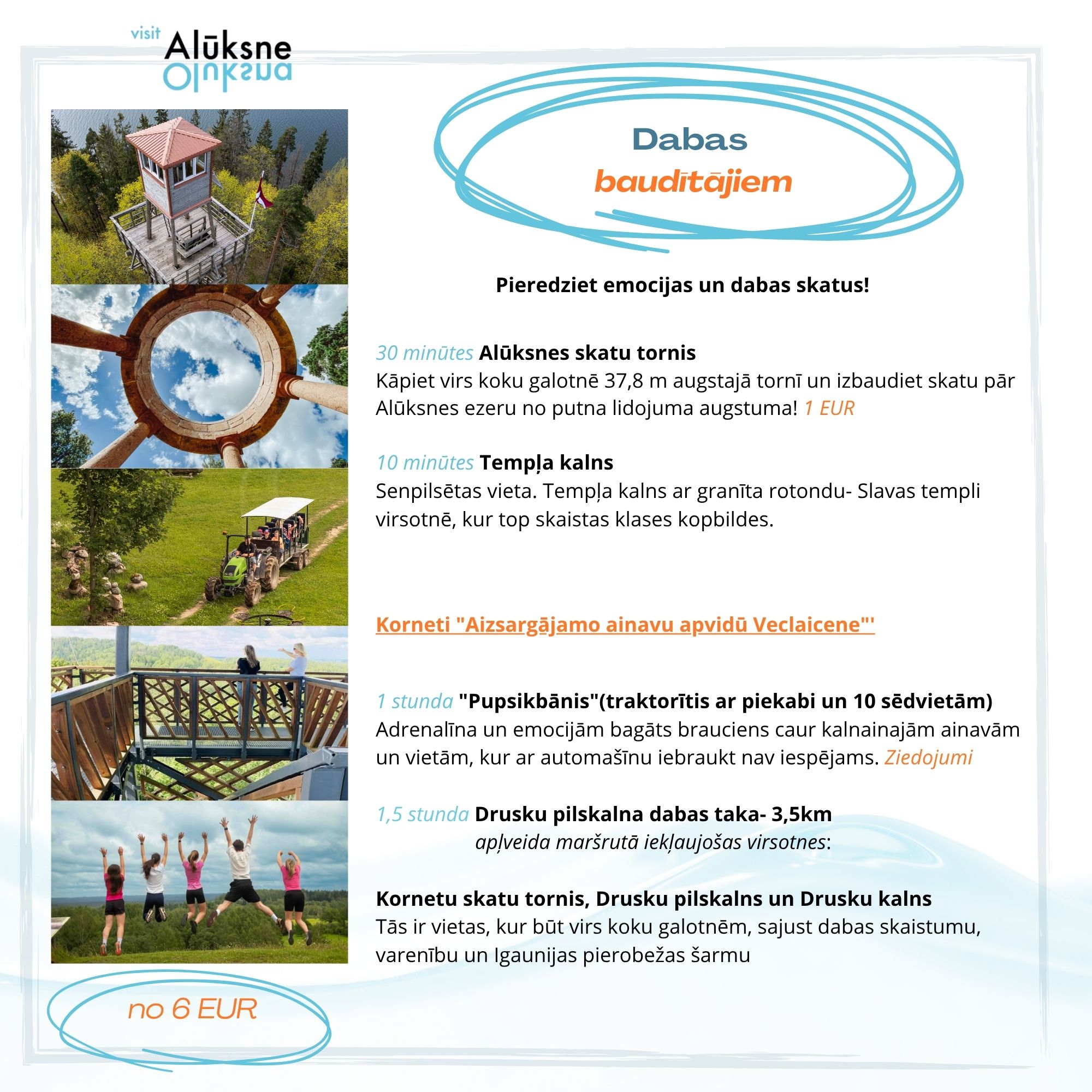 Dabas baudītājiem – Alūksnes skatu tornis, Tempļa kalns, “Pupsikbānis”, Drusku pilskalna dabas taka, Kornetu skatu tornis, Drusku kalns.