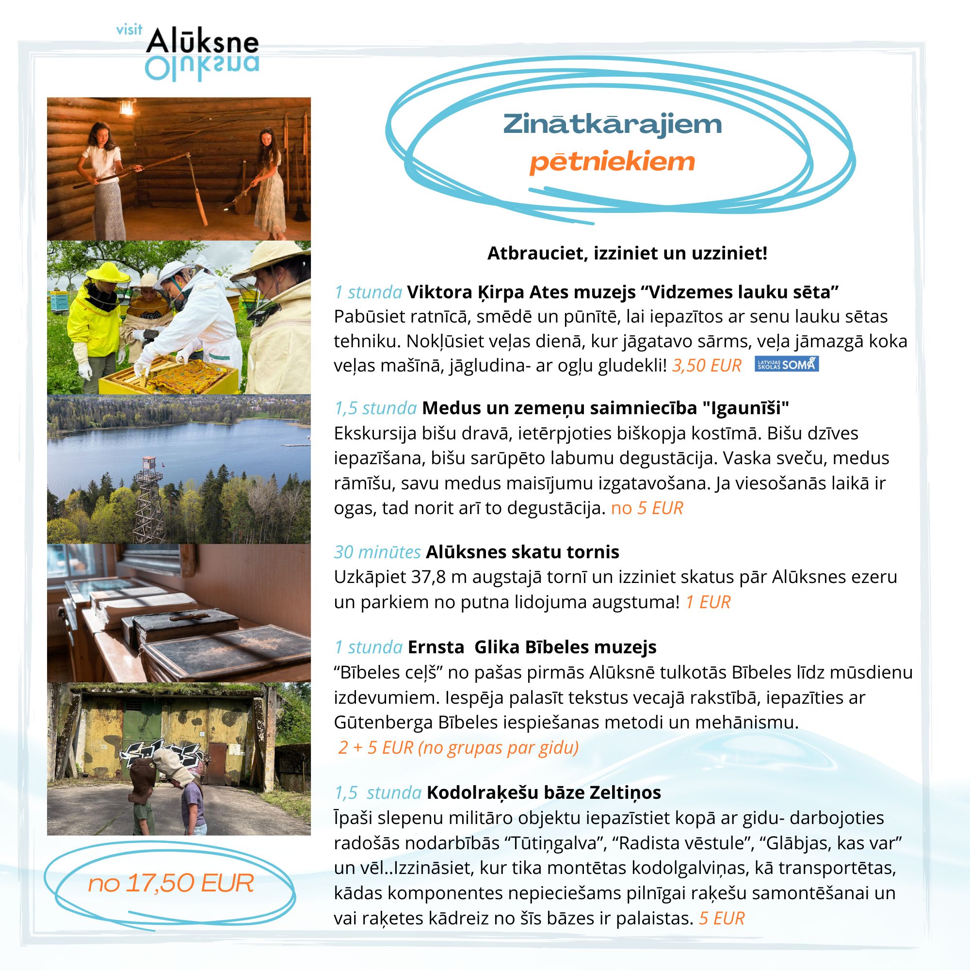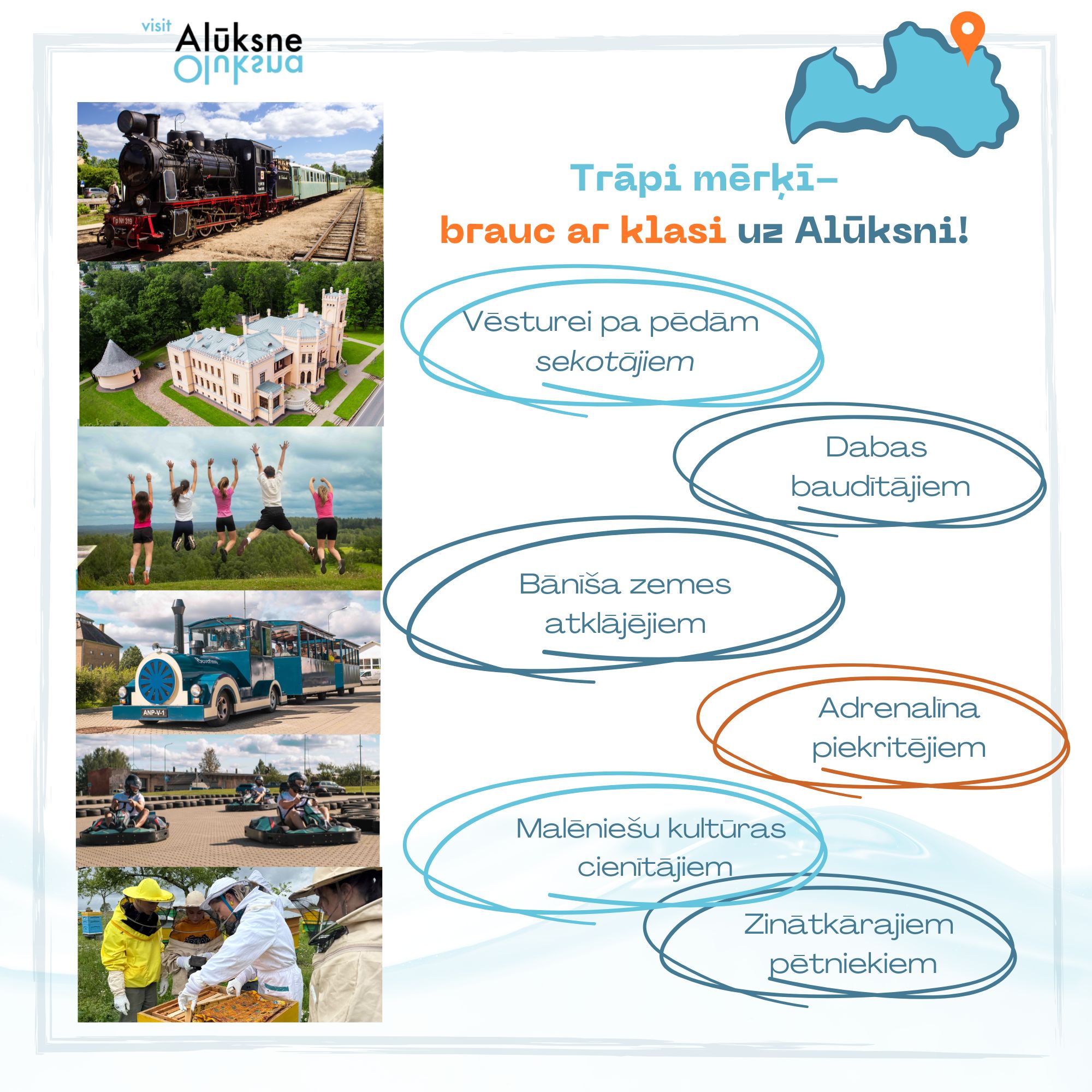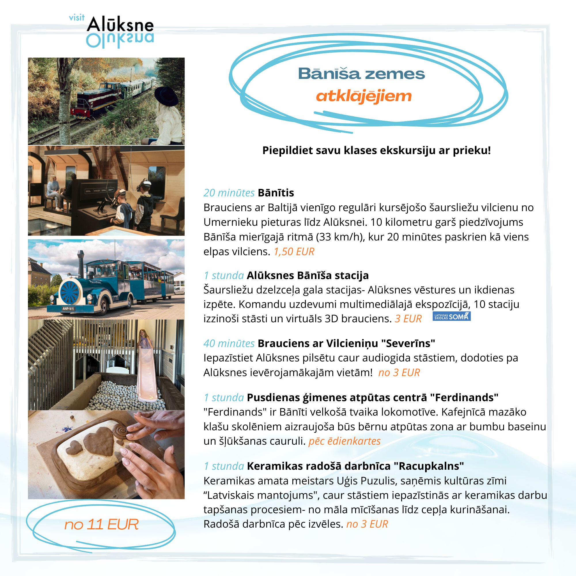 Skolotājiem pie ekskursijas plānošanas varam palīdzēt mēs- Alūksnes Tūrisma informācijas centrs! Droši zvaniet-29130280, 25442335 vai rakstiet uz tic@aluksne.lv ! Lūdzam ņemt vērā, ka piedāvājums var būt mainīgs, tai skaitā to ietekmē arī laikapstākļi.