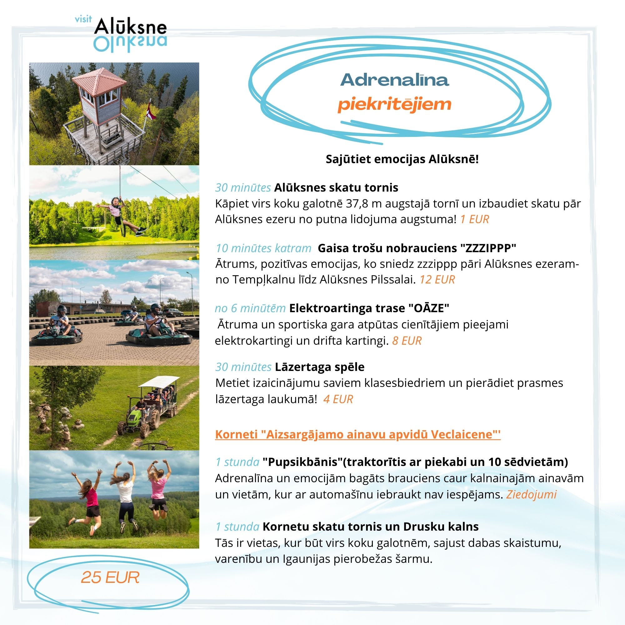 Adrenalīna piekritējiem- Alūksnes skatu tornis, zip-line “ZZZIPPP”, Elektrokartinga trase “Oāze”, Lāzertaga spēle, “Pupsikbānis”, Drusku pilskalna dabas taka, Kornetu skatu tornis, Drusku kalns.