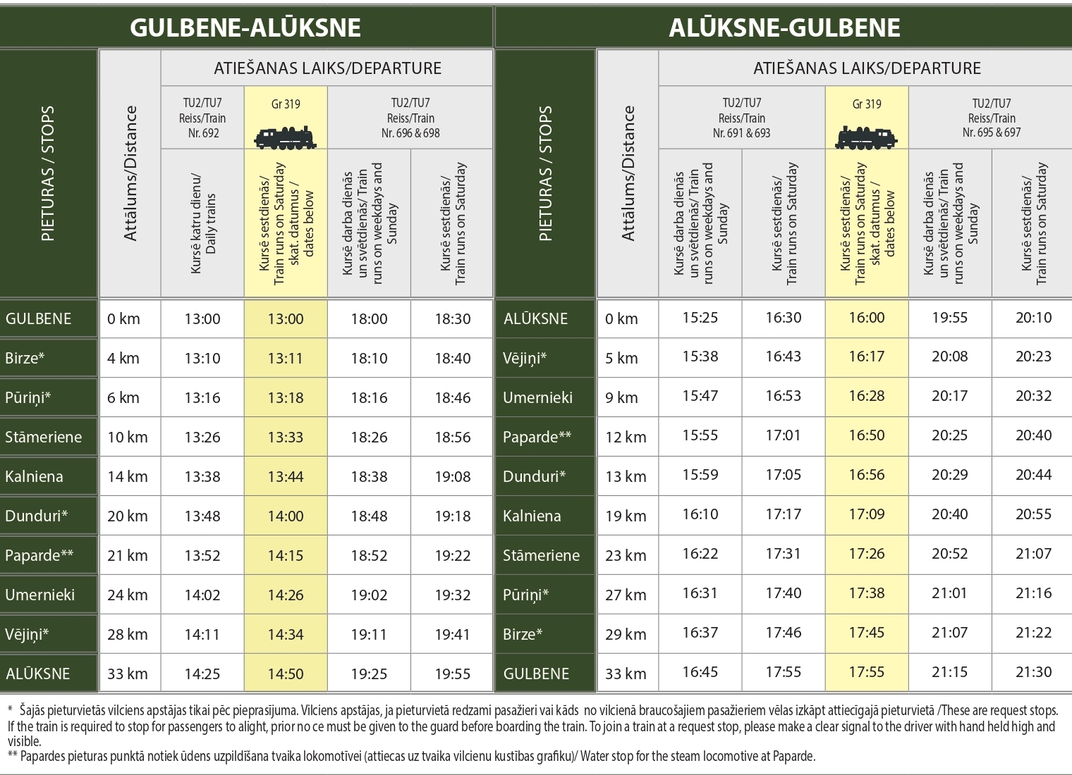Bānītis un tvaika lokomotīve Gr-319 “Ferdinands” 2026. gadā kursēs sestdienās sekojošos datumos: 4. un 18. aprīlī, 2., 16. un 30. maijā, 13. un 27. jūnijā, 11. un 25. jūlijā, 8. un 22. augustā, 5. un 19. septembrī, 3., 17. un 31. oktobrī, un 19. decembrī.