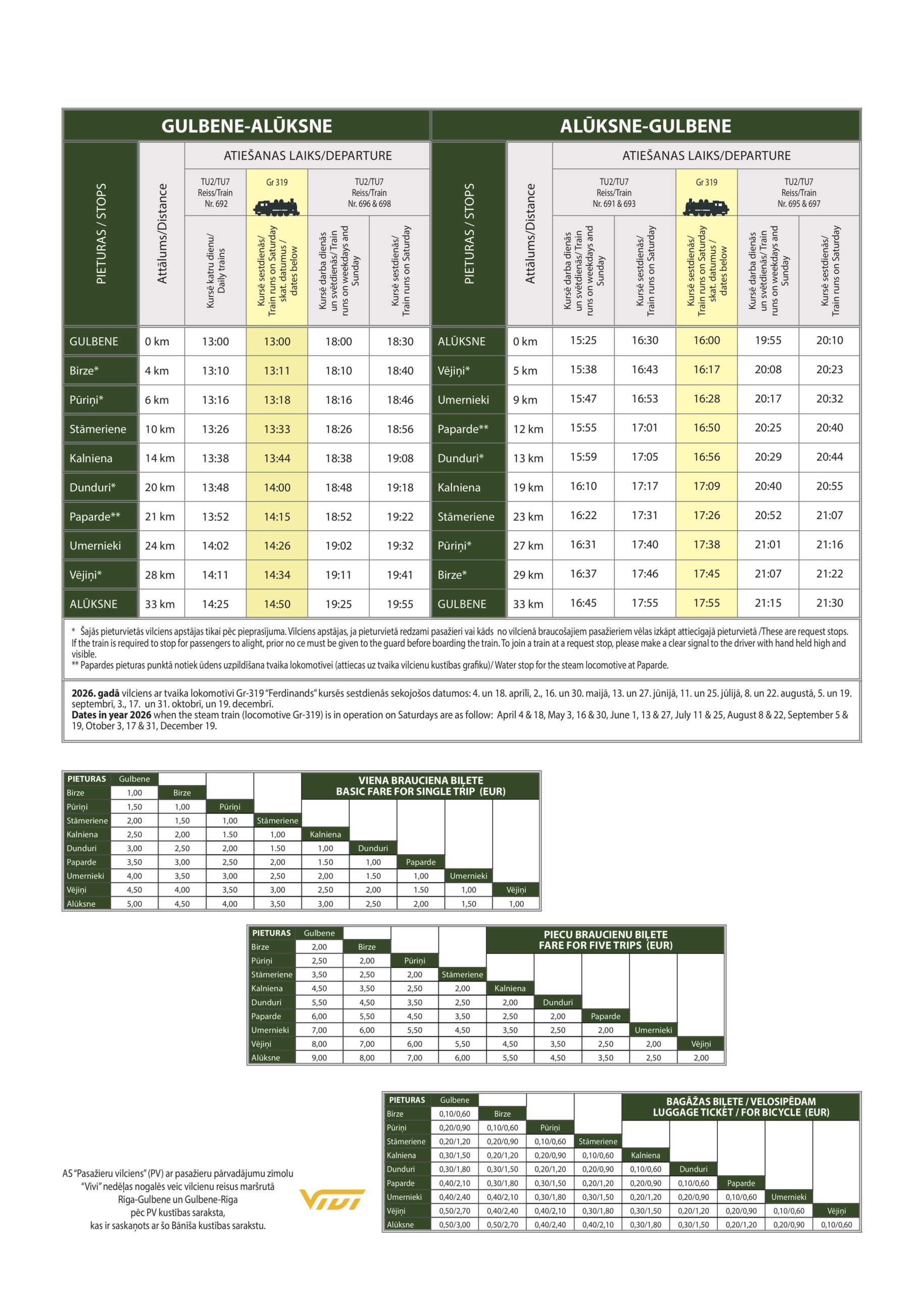 Tvaika lokomotīve Ferdinands un Bānītis 2026. gadā kursēs sestdienās sekojošos datumos: 4. un 18. aprīlī, 2., 16. un 30. maijā, 13. un 27. jūnijā, 11. un 25. jūlijā, 8. un 22. augustā, 5. un 19. septembrī, 3., 17. un 31. oktobrī, un 19. decembrī.